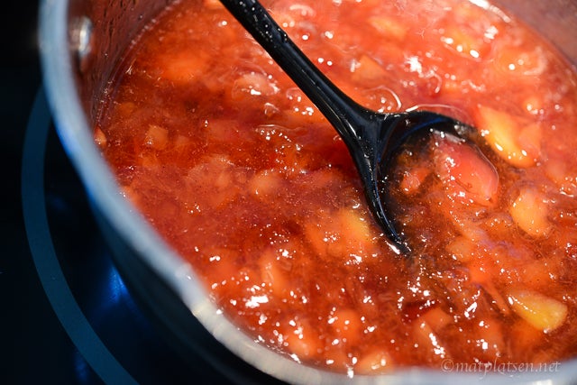 4. Tips plommonmarmeladen blir ännu bättre om ni kokar den med kärnorna kvar och sedan plockar upp dem i slutet.