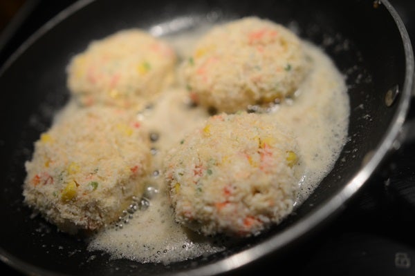Blanda ihop majonnäs och ägg i en bunke. Blanda sen i paprika, lök, majs, senapspulver och peppar. Vänd i krabbkött och 2 ½ dl panko. Forma crab cakes och vänd dem i resterande panko.