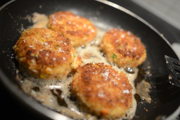 Hetta upp smör och olja i en panna och stek crab cakes gyllenbruna, krydda med lite flingsalt och servera med tartarsås.