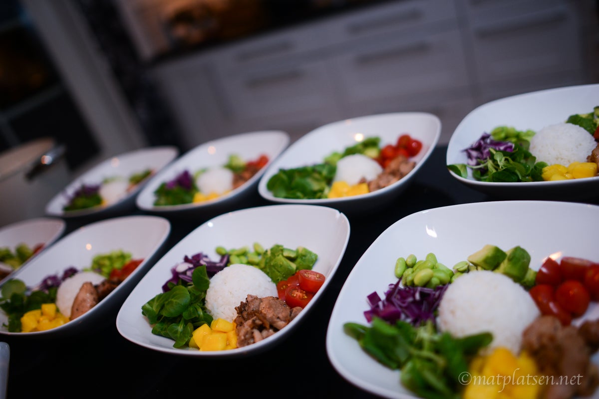 När du har kokt ris, marinad/sås, grönsaker, frukt och kyckling förberett är det bara att lägga upp – riset i botten/mitten och sedan arrangerar du grönsaker och frukt samt kyckling som du vill runtom. Skeda över några tsk av marinaden/såsen. Resten av såsen samt extra med ljus soja och Sriracha-sås kan serveras vid sidan. (Recept från receptfavoriter.se)