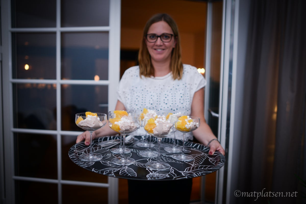 Blanda grädde, kakao och socker och vispa till ett fast skum. Skala apelsinen med en kniv och skär fruktköttet i små bitar. Skär glassen i kuber. Varva grädde, apelsin, glass och maränger på ett stort fat eller i portionsskålar.