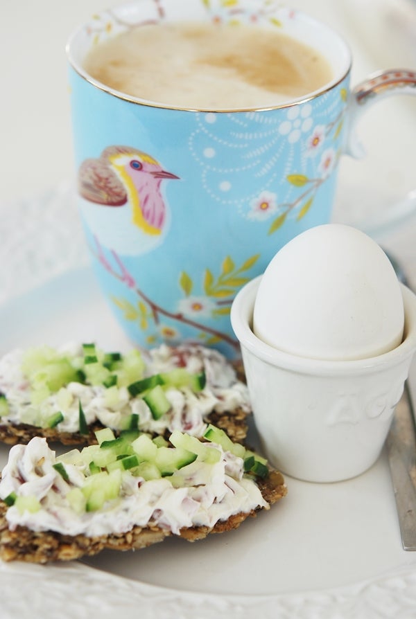 Gofrukost med fröknäcke, ägg och latte. Tallrik/Mateus, mugg/PiPstudio,  äggkopp/BrukaDesign.