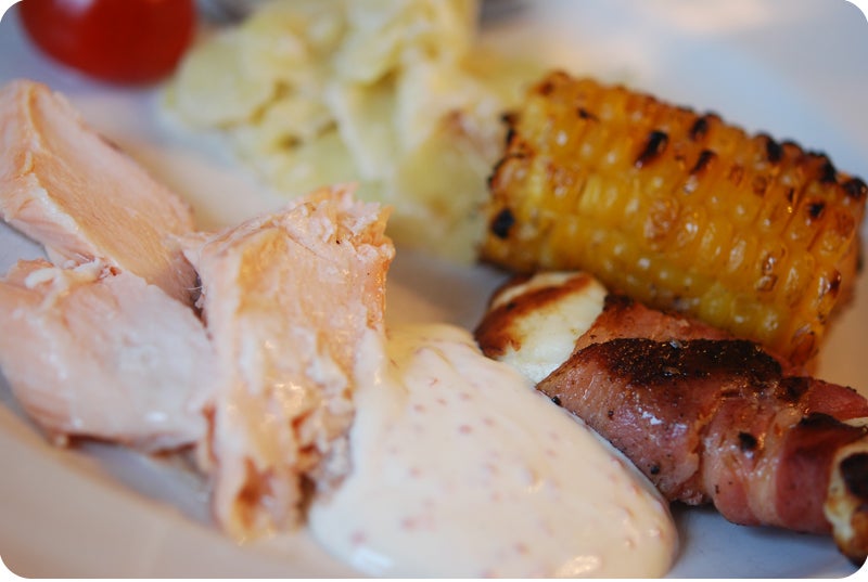 Hej hej! Kikar in en snabb sväng, just kommit hem från middag hos goda vänner och stoppat sovande i sängen som fick bäras hem ♥ Vi bjöds på god 3-rätters med svampsoppa till förrätt, grillad lax med tillbehör (romsås, gräddstuvad vitkål, majs, baconlindad haloumi) och till dessert pannacotta.