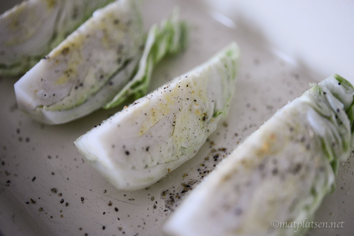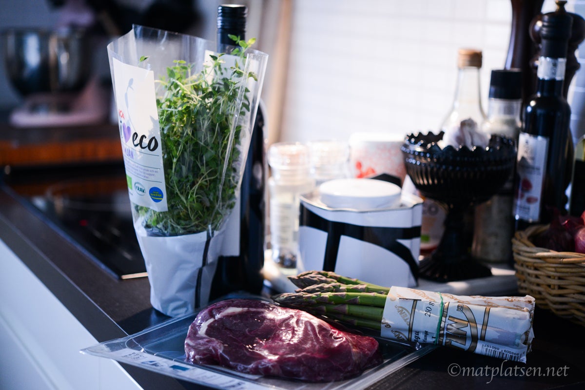 A och O är goda råvaror. Hittade fina skivor entrecôte med mycket insprängt fett, purfärsk sparris, ekologisk spetskål och färdig färsk rotfruktspytt (smidigt alternativ men annars kan man såklart göra egen). Salta och stek pytten i smör tills den fått fin färg. Bryn sparrisen hastigt i smör (den ska fortfarande vara krispig) och skär kålen i klyftor och baka i ugnen med lite olja, salt & peppar på, ca 20-25 min. Ta fram köttet i god tid, gärna en timma innan det ska stekas. Klappa köttet torrt med lite papper, salta & peppra. Stek i rikligt med smör och olja, ca 1 1/2 min per sida för medium kött. Ös med smöret under tiden.