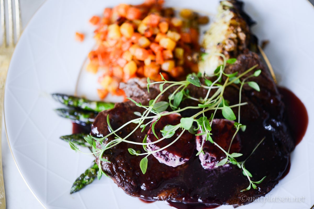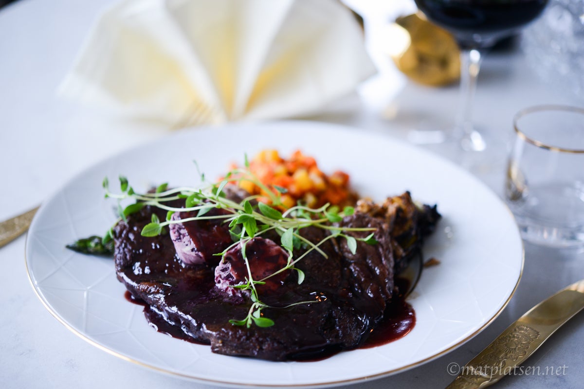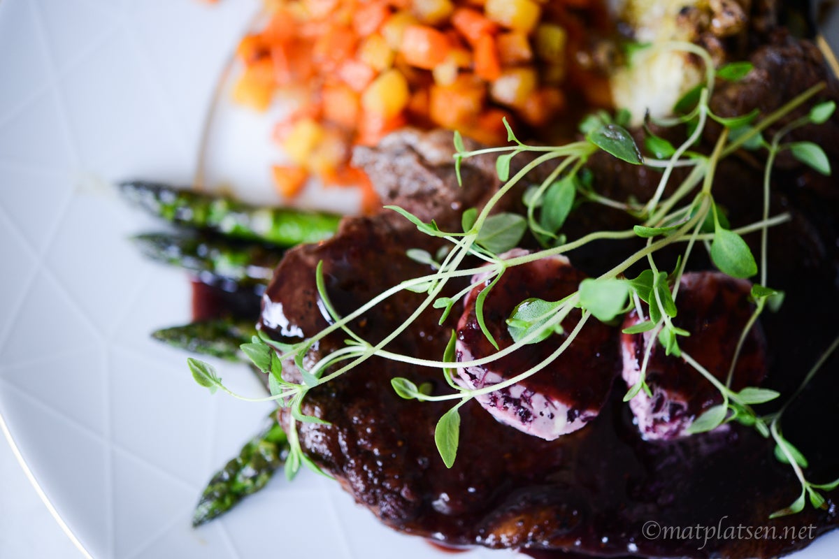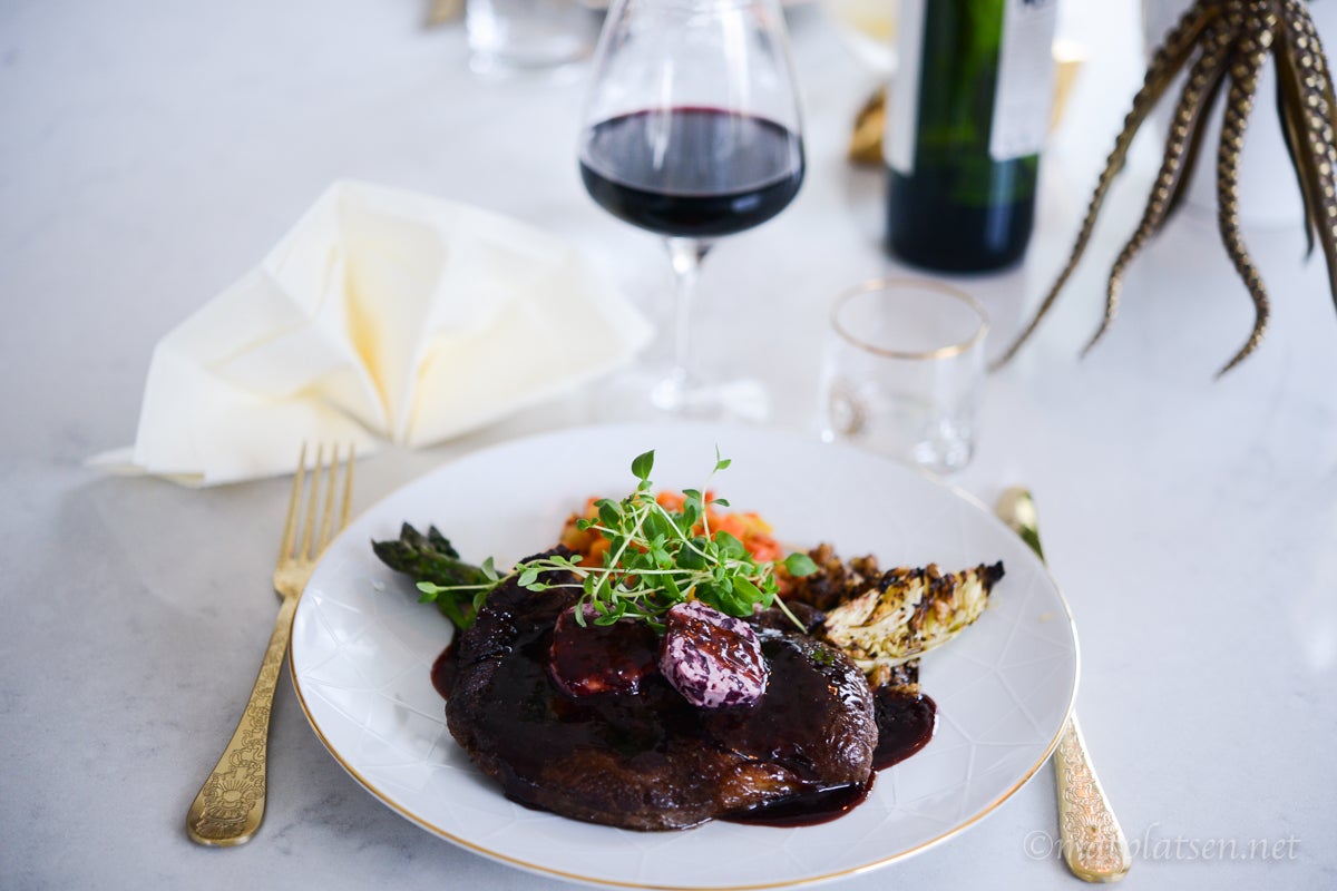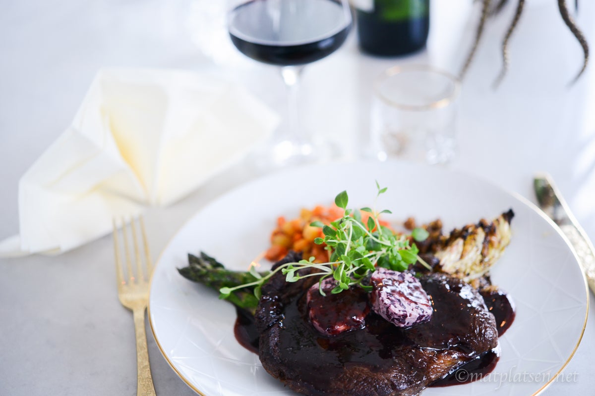 Bestämde mig för att testa det till entrecôte med rödvinssås (på samma vin) och rödlökssmör, med ugnsrostad spetskål, sparris och rotfruktspytt. Så himla gott!