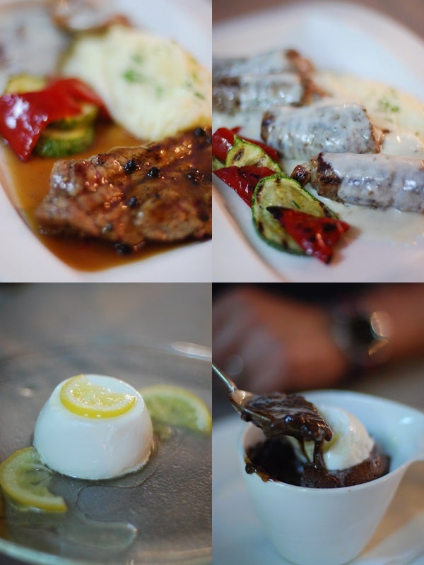 Till huvudrätt valde Micke oxfilérullader med haloumi och soltorkade tomater med ostsås och potatispuré (grymt god puré!!) och jag tog en Black & White med fläskfilé/ostsås och entrecote/pepparsås. Och sen var vi egentligen hur mätta som helst men beställde in varsin dessert, kräääämig chokladfondant med glass och en fräsch pannacotta med citronsås. (Kan ni gissa vem som tog vad??)