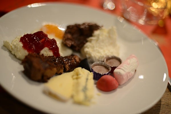 Glögg innan maten (där har vi ju en julstämningshöjare till, värm på lite glögg i tid och otid, finns goda både alkoholfria och lite starkare varianter) och sedan ett fantastiskt gott och vällagat julbord. Där var supergod lax i olika former, ägghalvor, omelett, sill, köttbullar, prinskorv, revben, skinka, jansson (god!! viktigt viktigt!) och ja allt som hör julbordet till. (Extra plus för att där fanns 3 saker jag alltid brukar sakna – mimosasallad, äppelmos & brysselkål!) Inget överdåd men litet och mysigt och fräscht och fint. Och till dessert åt vi den godaste kladdkaka vi nånsin smakat, en grym vit choklad mousse och annat gott. Mums! Fick höga betyg av hela gänget.