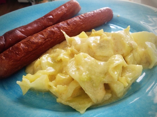 (Vitkålen bara skär jag i bitar, ner i en liten teflonpanna, på med grädde och lite salt. Sen får det koka i hop tills vitkålen mjuknat och grädden blivit krämig. Mums!)