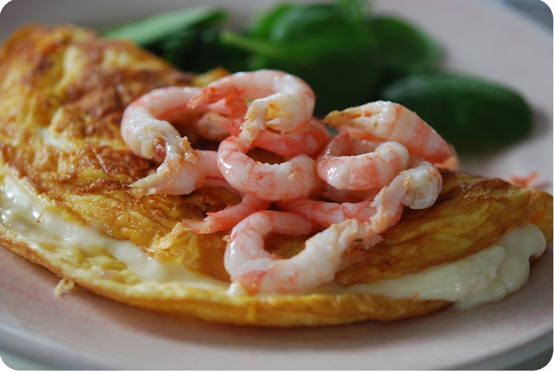 Denna omelett (ägg + grädde + salt) fick sällskap i smeten av hackad tomat och schalottenlök samt en näve god riven ost. När den var färdig spritsade jag ut en klick räkost på tub, vek i hop den och toppade med skalade räkor. Yummi!