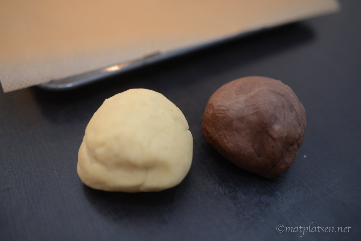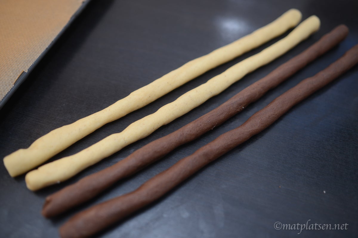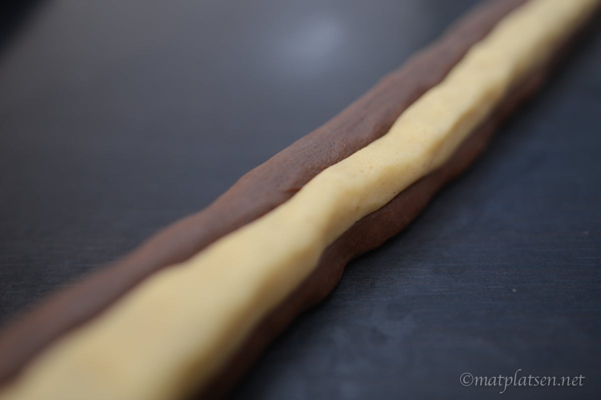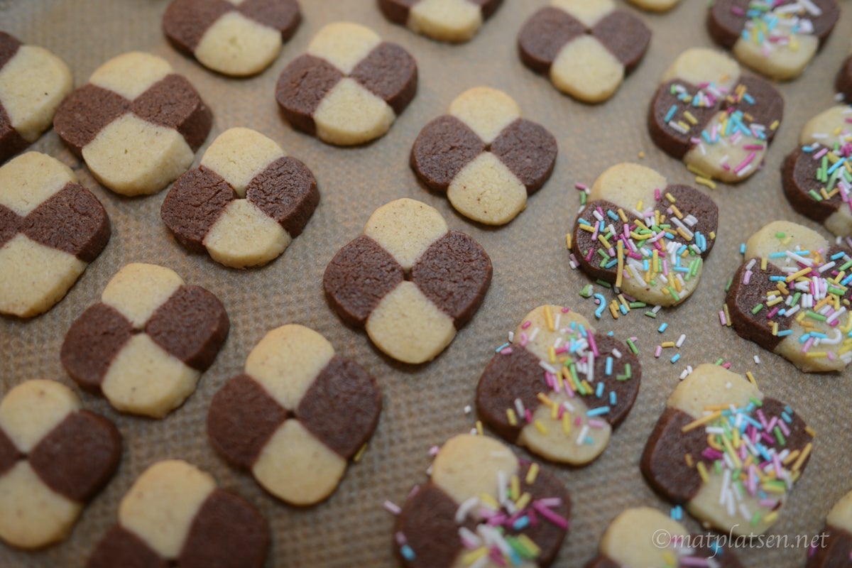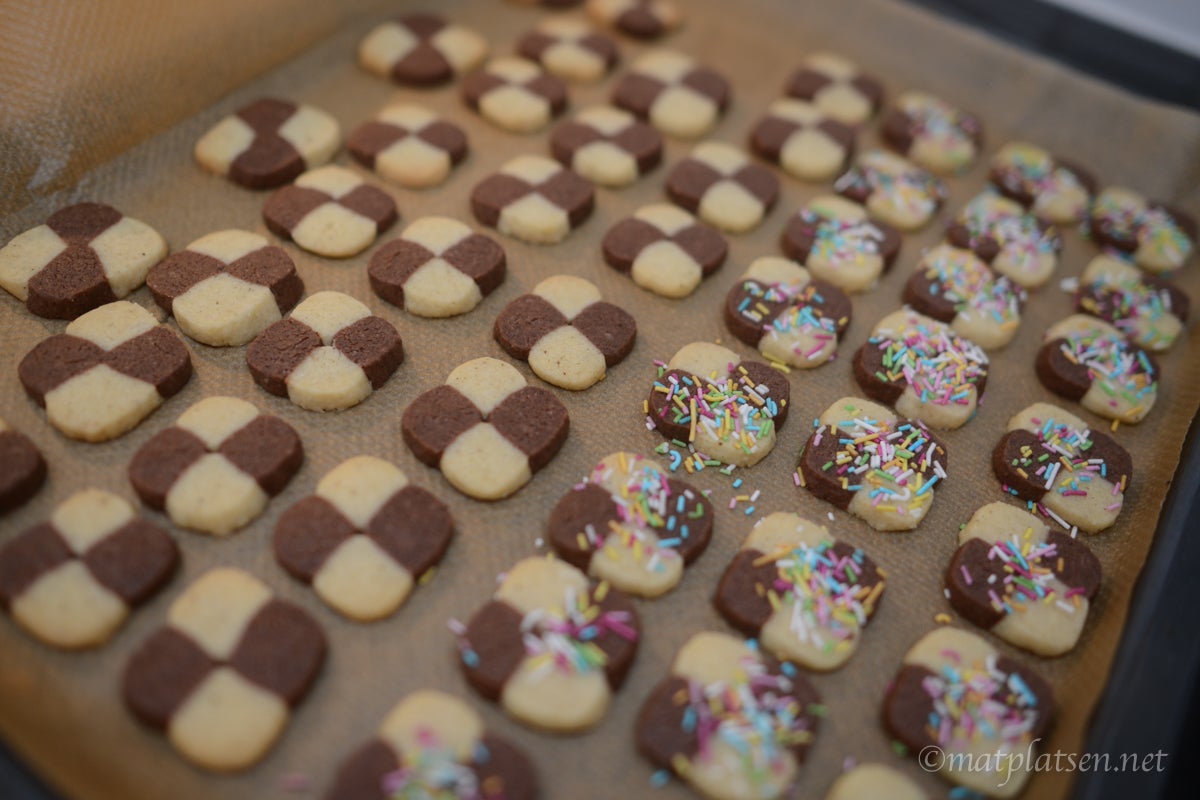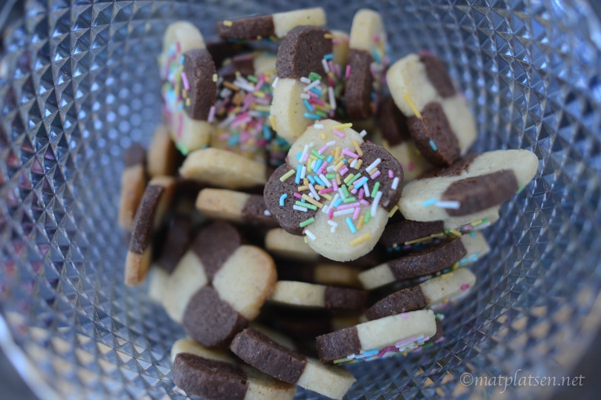 Blanda ihop smör, socker och mjöl till en deg. Dela degen i två delar och smaksätt den ena med vaniljsocker och den andra med kakao. Dela dem i två delar var och rulla ut till ca 30 cm långa längder. Lägg ihop dem till ett shackmönster och tryck till så rullen blir lite kantig. Låt vila i kylen ca 30 min och skär sedan 1/2 cm tjocka skivor. Strö strössel på om så önskas. Grädda kakorna i 200 C (175 varmluft) i ca 10 min.