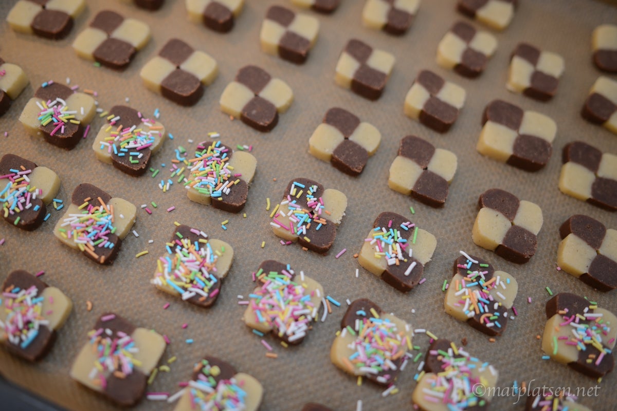 Ny vecka. Nu kör vi! Tänkte baka en del denna vecka. Småkakor! Småkakornas småkaka här hemma är schackrutor. Barnen är tokiga i dessa. Och de är ju faktiskt bra goda och enkla att baka. Har strössel på i bland, då blir de lite extra festliga.