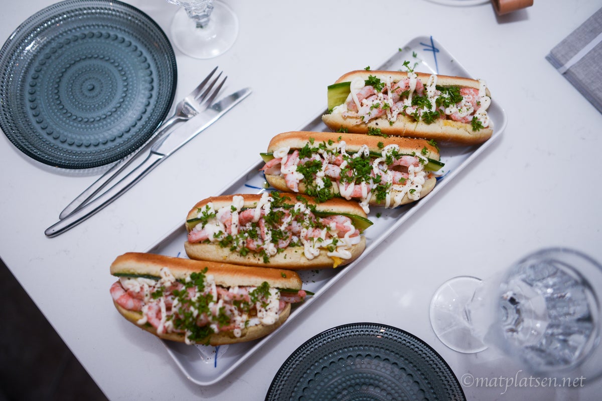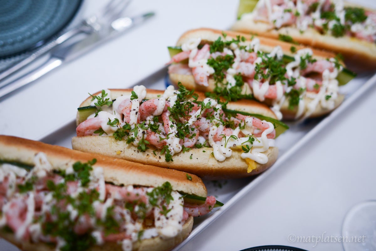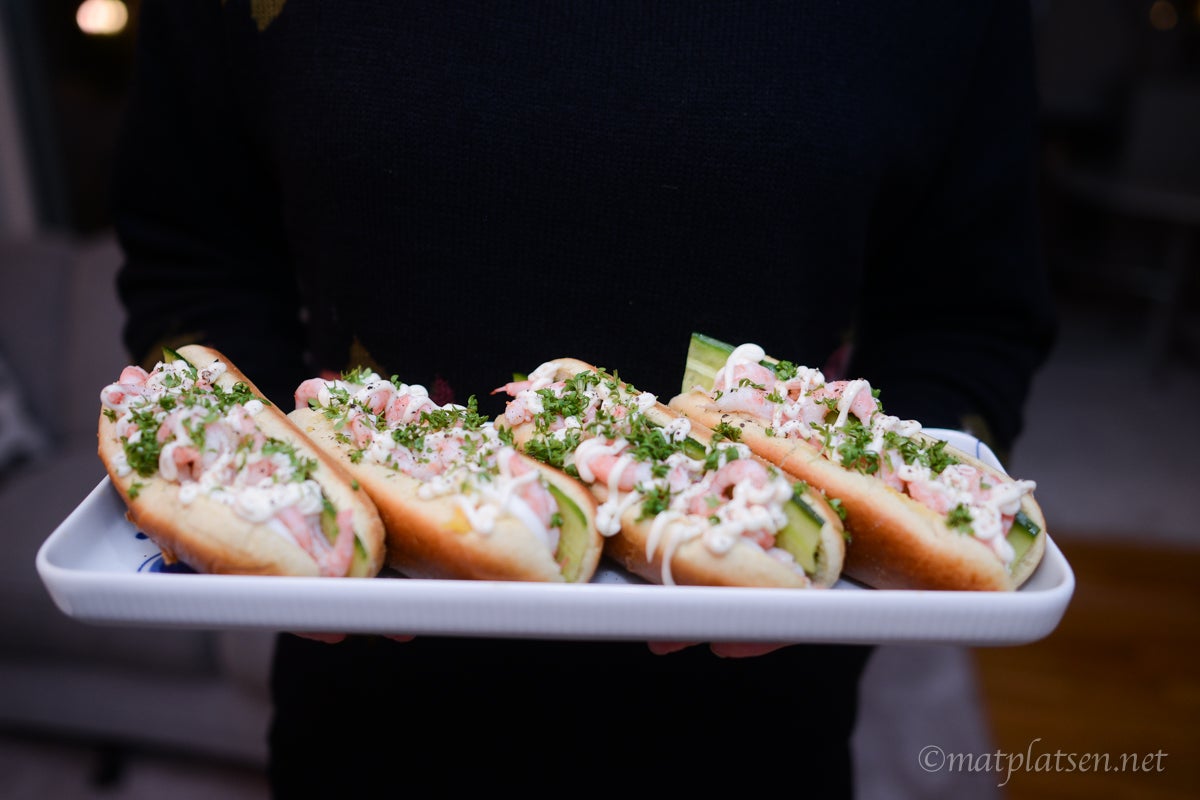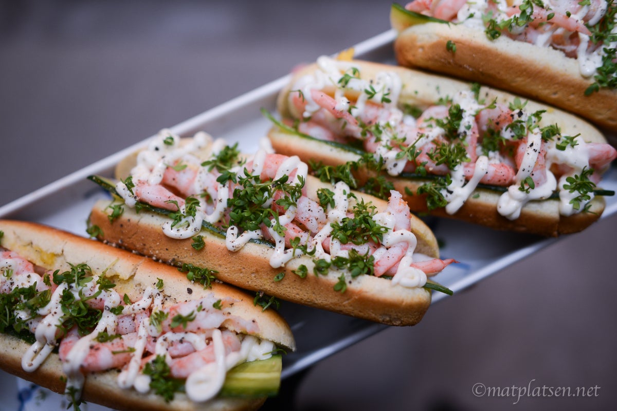 Skala räkorna. Hacka äggen i mindre bitar. Hyvla eller skär långa remsor av gurkan och vänd dem i olivolja och citron. Lägg en gurkskiva i korvbrödet (rosta gärna bröden något i ugn innan), toppa med ägghack och räkor. Ringla över majonnäs, strö över krasse, salt & peppar.
