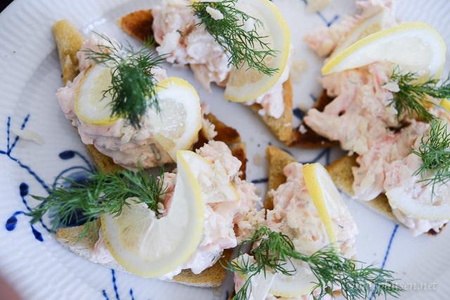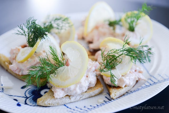 Skala räkorna och hacka dem grovt. Blanda med majonnäs och smaka av med salt & peppar och finklippt dill. Låt gärna stå och dra en stund i kylen. Skär bort kanterna på bröden och dela dem diagonalt. Stek i rikligt med smör på båda sidor. Lägg upp på ett serveringsfat och toppa med skagenröran, en citrpnskiva och en dillkvist. Enkelt men sååååå gott. Lite av det godaste jag vet faktiskt.