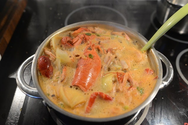 Egen buljong: Skala skaldjuren, krossa dem lätt och lägg i en kastrull. Hacka en gul lök, skiva en morot och fräs detta med skalen i olja. Tillsätt en klick tomatpuré, 1 dl vin, fänkålsfrön, 5 vitpepparkorn och häll på med vatten så det täcker. Låt koka ca 20 minuter, sila bort skalen och låt reducera tills 2/3 återstår. (Den ska inte vara för stark om den ska användas som buljong. Späd med vatten om den blir för koncentrerad i smaken).