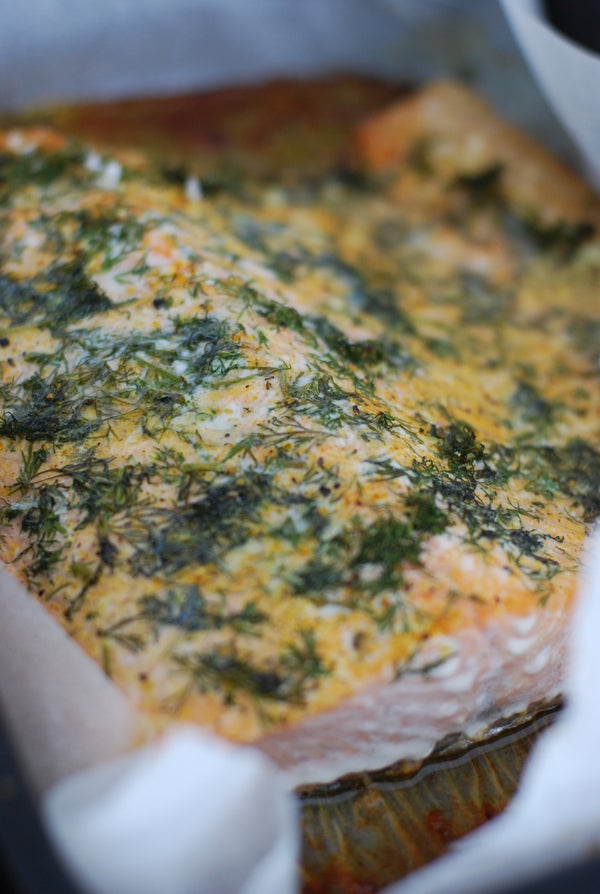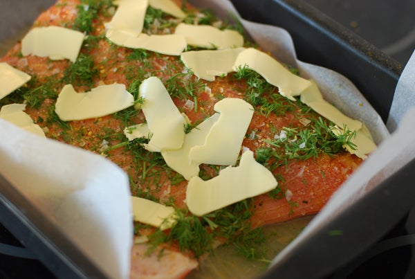 Färsk lax är ju så himla himla gott! Och går att tillaga på hur många sätt som helst. Här har jag haft på flingsalt, peppar, färsk dill, en skvätt vitt vin (matlagningsvin går utmärkt) och hyvlat över lite smör. In i ugnen på 150 C i ca 30 min, beroende på hur stor bit man har.