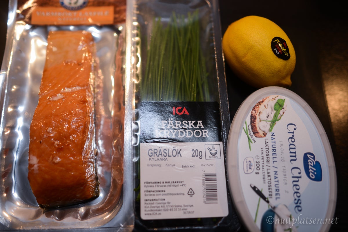 Laxröra: Finhacka gräslöken. Dela laxen i bitar med en gaffel och rör ihop med gräslök och färskost i en bunke. Smaka av med citronsaft, salt och peppar. Ställ kallt.