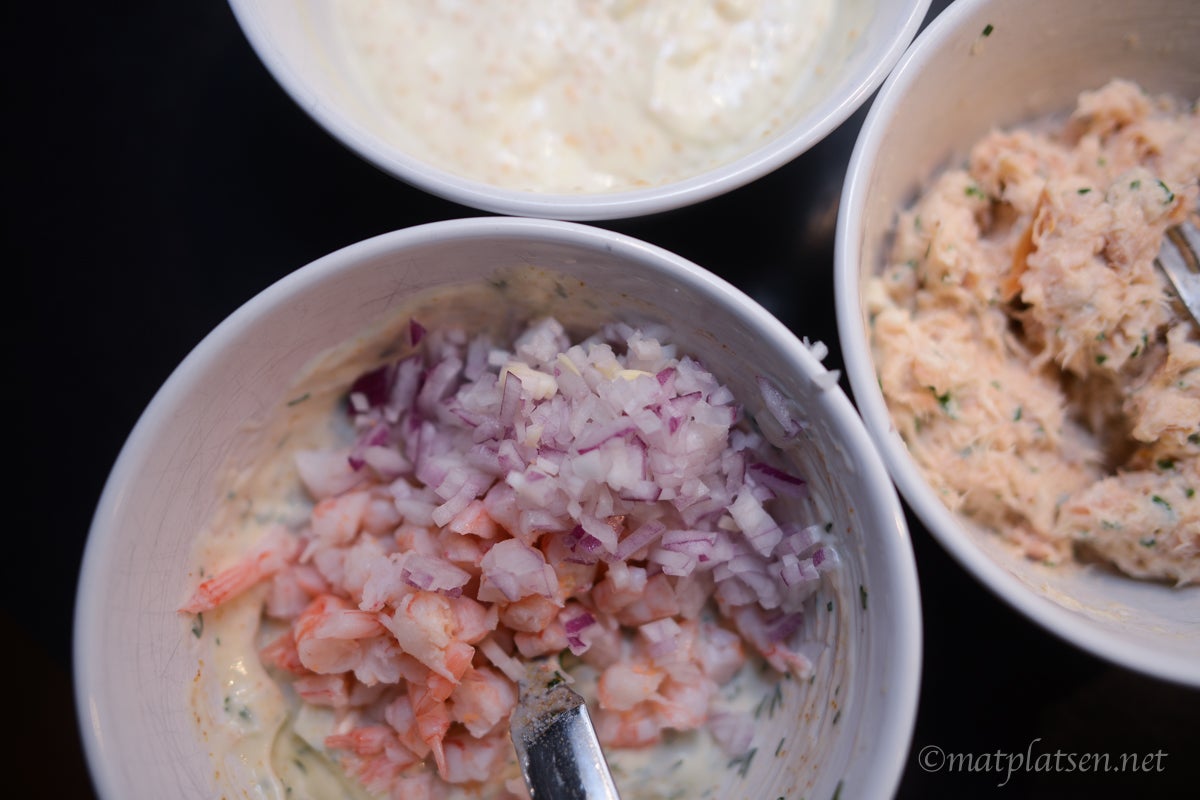 Räkröra: Finhacka dill och rödlök. Grovhacka räkorna. Blanda ner hacket i majonnäsen. Smaka av med citronsaft, salt och cayennepeppar. Ställ kallt.