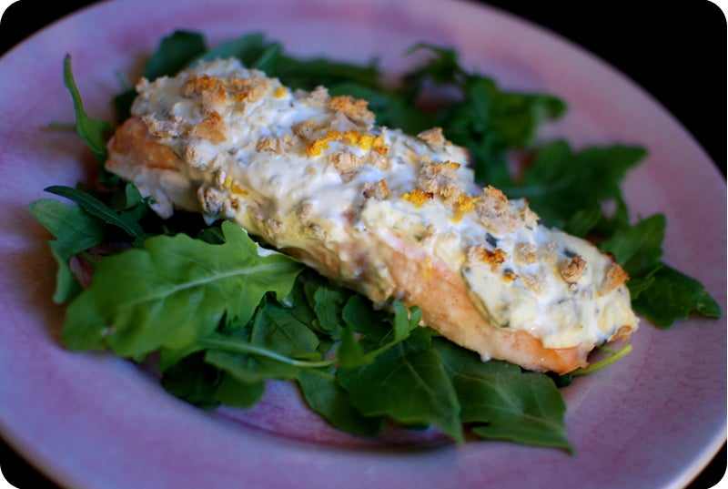 Värm ugnen till 180 C. Mixa brödet och citronskalet (för hand eller med mixer). Lägg laxen i en ugnsfast form, Bred philadelphia på varje bit. Strö över brödsmulet. Baka laxen ca 15-20 min. Serverad med en blandad sallad och citron.