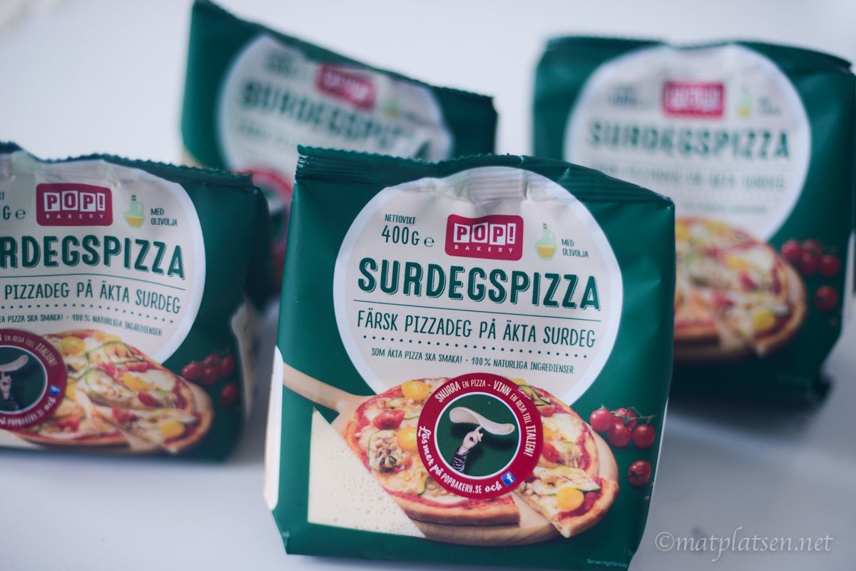 Färdig pizzadeg är något vi i princip alltid har i kylen och denna surdegspizzan är grym!