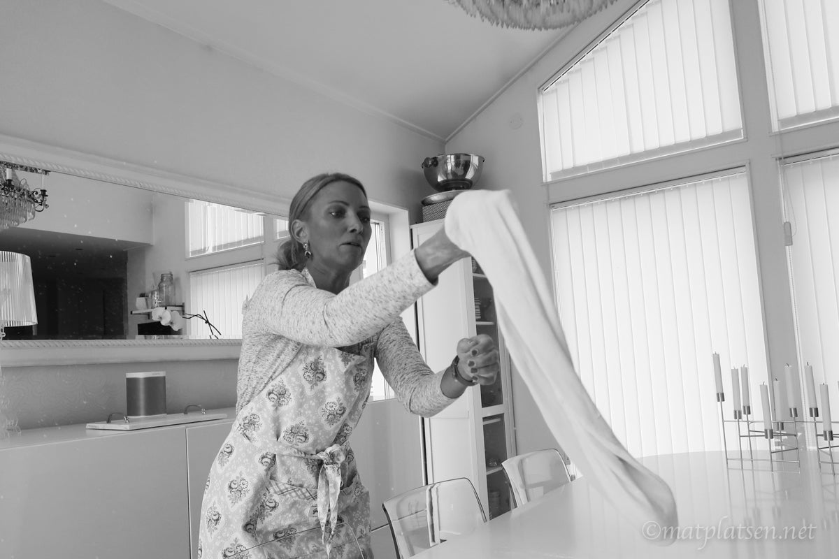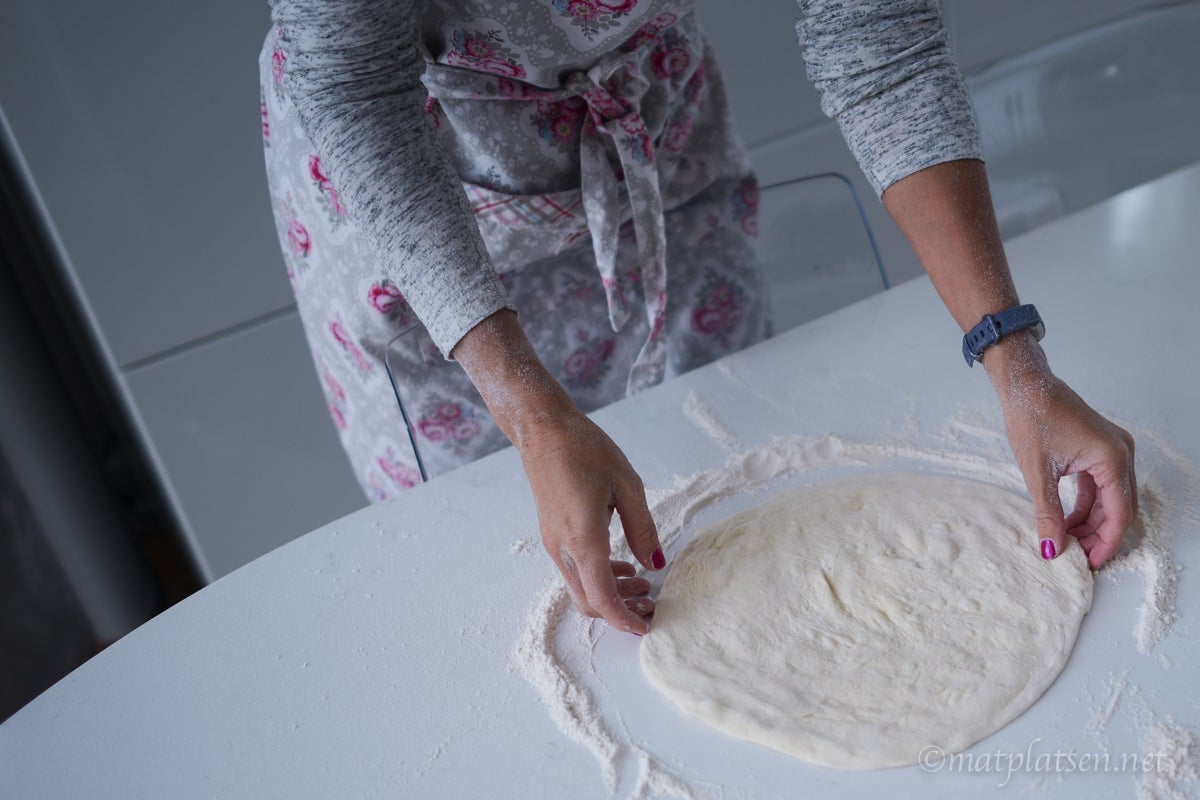 - kasta upp pizzan i luften. Fortsätt tills pizzan är rund och fin.
