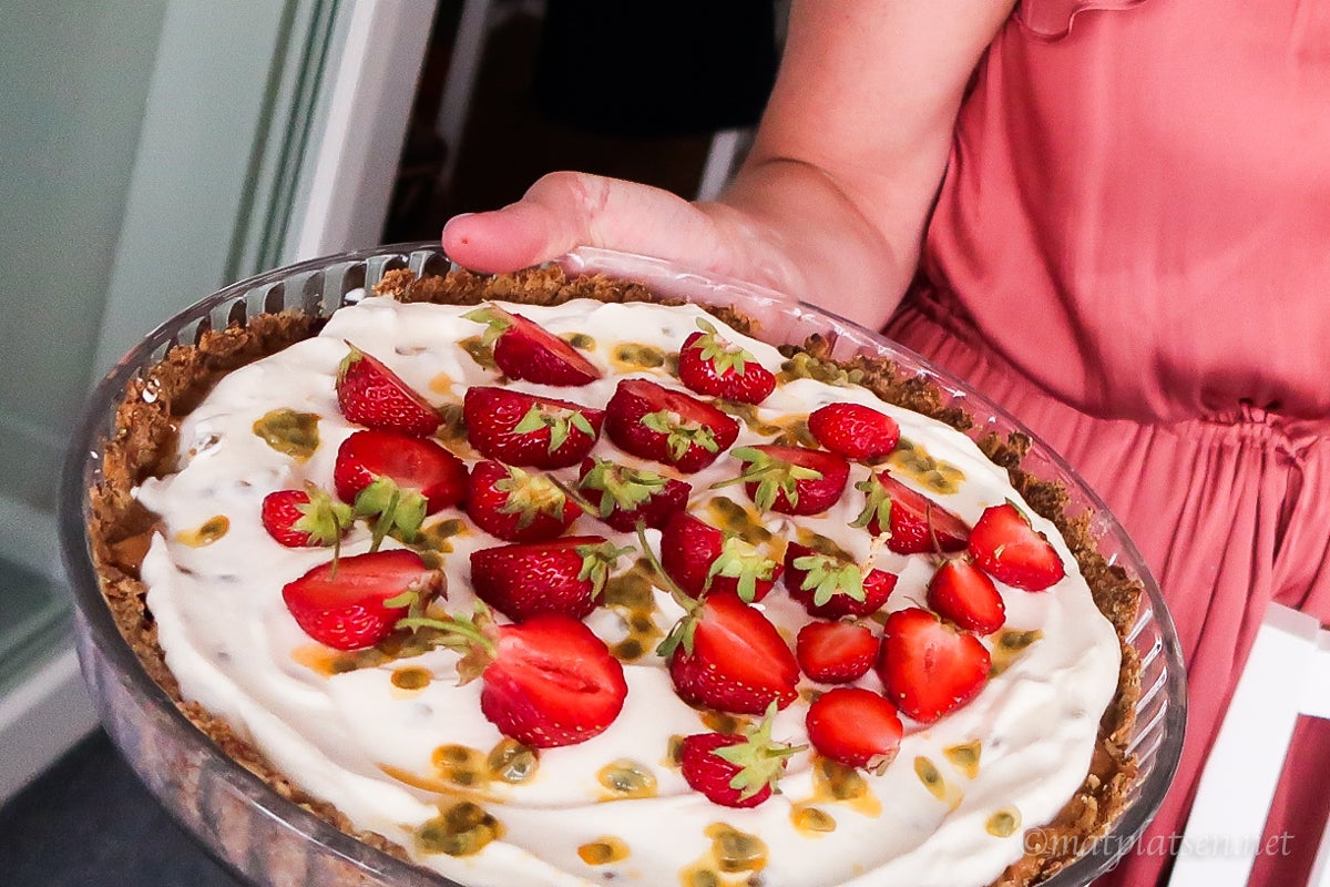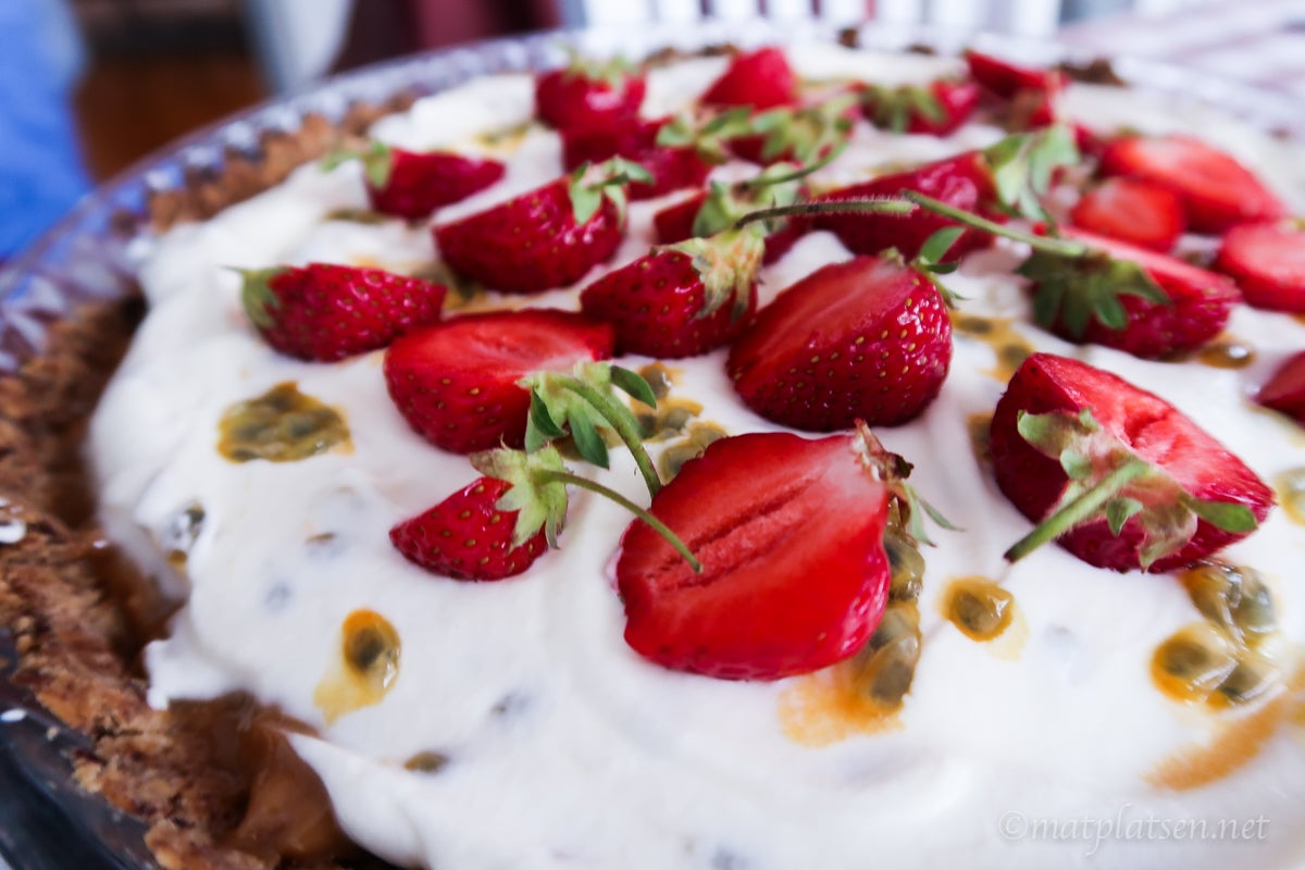 Jordgubbspaj med passionskräm och dulce de leche