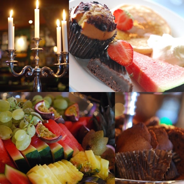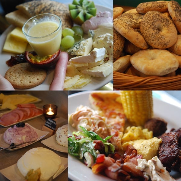 Bagels, jag älskar bagels! Med flera olika färskostar till (tex en med blåbär i och en med oliver i – gudagod!). Ostar, kex, marmelader, skinka, smoothies, juice, kaffe, icetea, färska frukter, caesarsallad, coleslaw, pajer, revbenspjäll, kycklingvingar, majskolvar, köttbullar, bacon, korv, äggröra, american pancakes med lönnsirap och grädde, muffins och en kladdig chokladkaka för att nämna det som hamnade på mina tallrikar 🙂 Mums!! Älskar denna mix av mat, lite mindre frukostkänsla utan mer lunch-brunch.