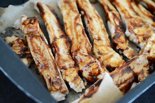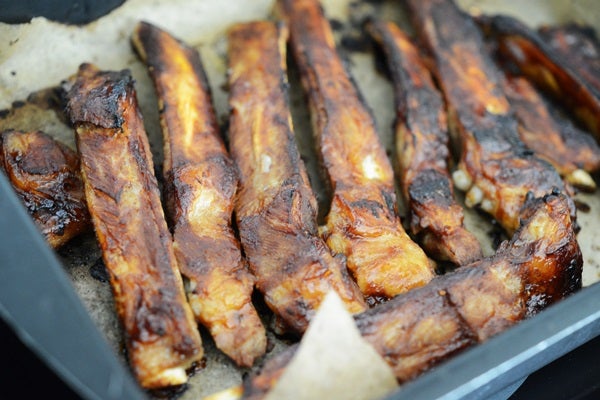 Blanda en glace på 1 dl ketchup + 1 dl bbqsås + 2 msk kinesisk soja + 2 msk sirap + salt & peppar. Pensla detta runtom revbenen och grilla dem i ugnen 225 C tills de fått fin färg.