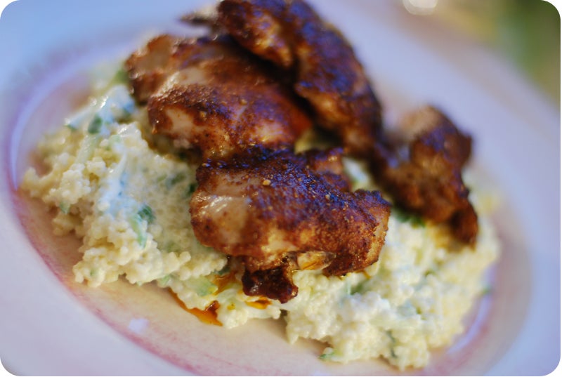 Spiskumminkryddade kycklinglår med krämig couscoussallad
