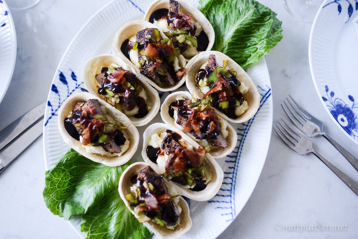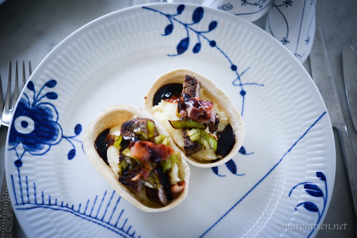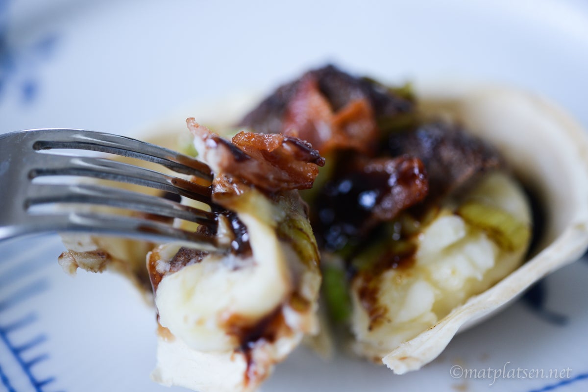 Värm tortillabåtarna enligt anvisningar. Klicka i moset i botten, toppa med några strimlor biff, purjolök och bacon. Ringla över lite sås och servera genast.