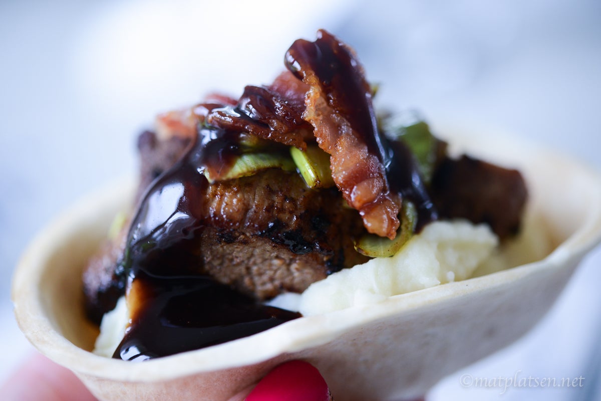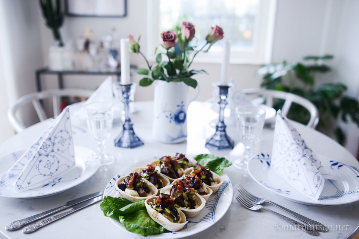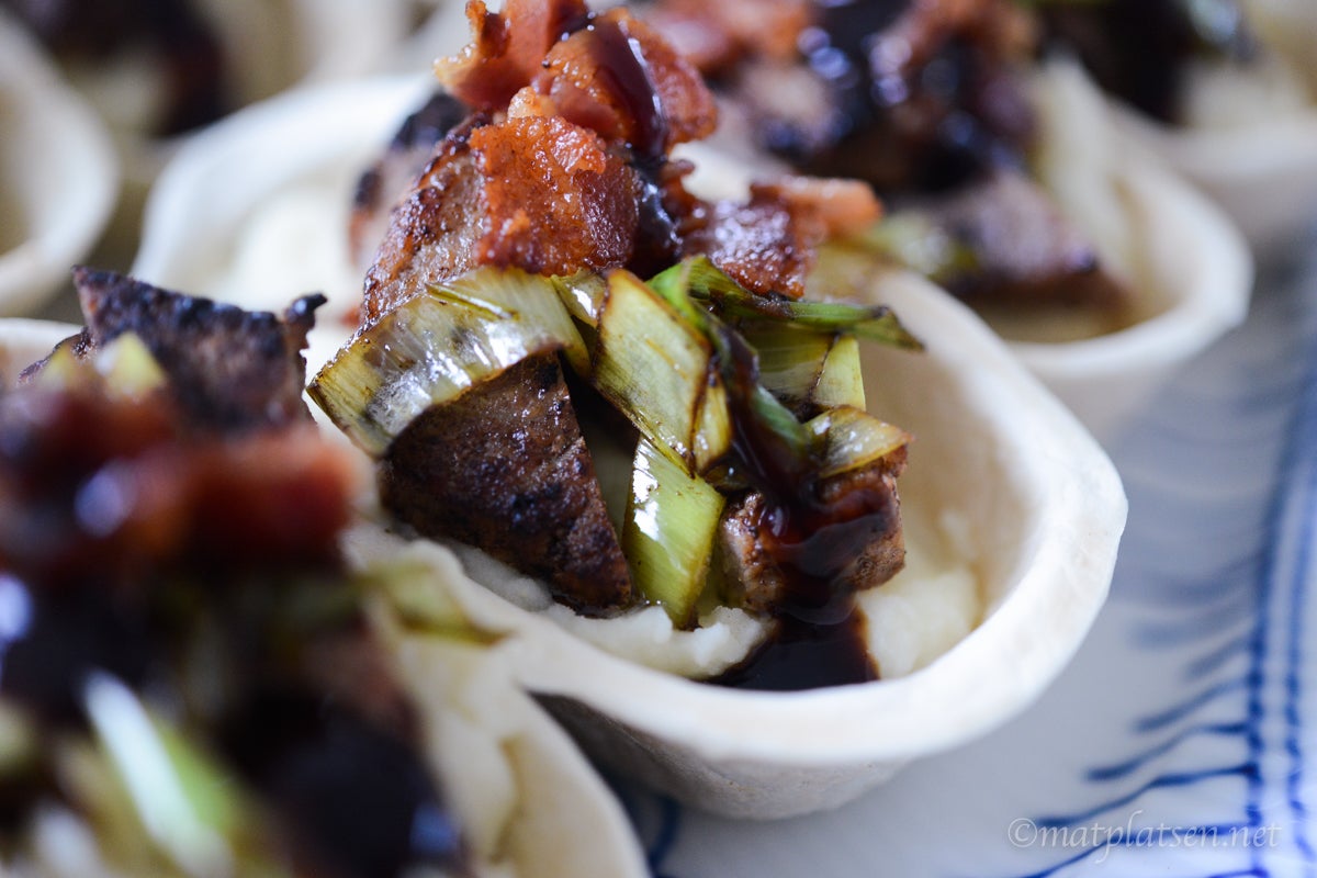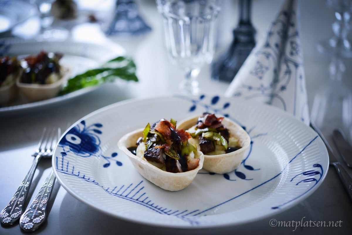 Värm tortillabåtarna enligt anvisningar. Klicka i moset i botten, toppa med några strimlor biff, purjolök och bacon. Ringla över lite sås och servera genast.