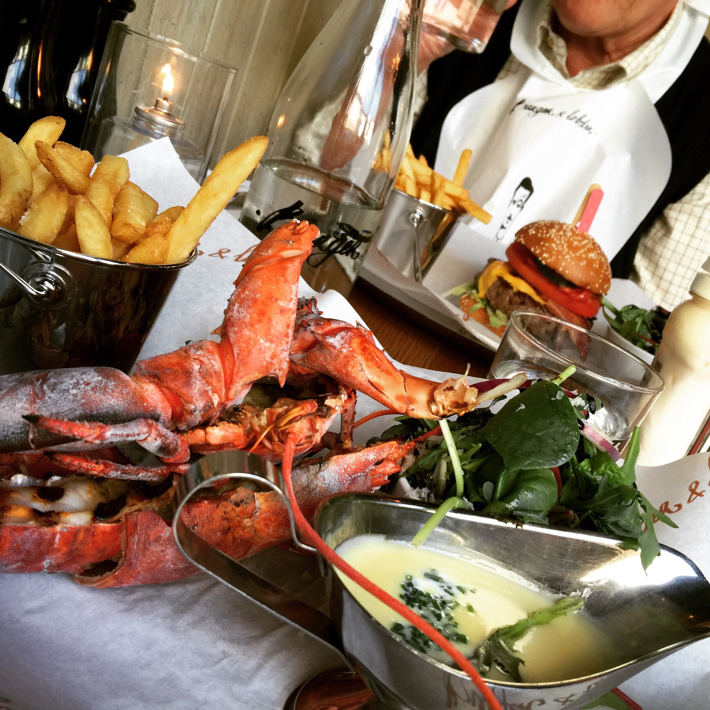 Det blev ett besök på Burger & Lobster, grillad hummer och ett glas fredags-skumpa, pappa (som är allergisk mot skaldjur stackarn) tog burgaren (som var grymt god den också). Om ni inte känner till konceptet så är det en kedja (har ätit på den i London och den i NYC tidigare) och det finns bara 3 saker på menyn: burgare, hummer, lobster-roll. Och samma pris för alla. Smidigt 🙂 Och sjukt gott!