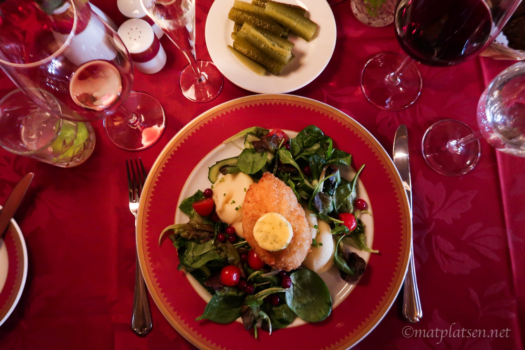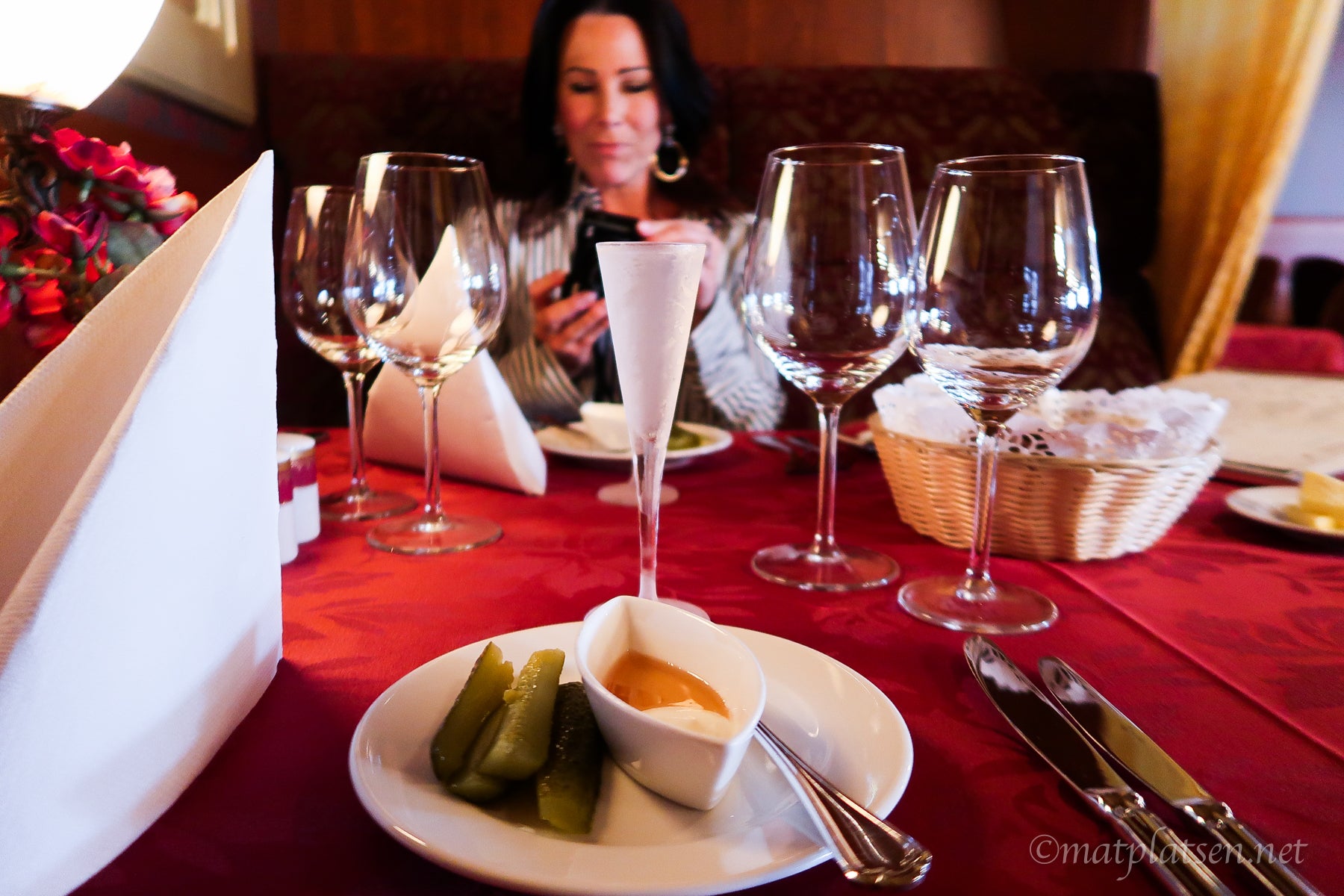 Första kvällen hade vi middag bokat på den ryska restaurangen Alexandra. Väldigt lugnt på båten, inte mycket folk så här års mitt i veckan och vi var nog yngst hehe. Passade oss perfekt. Vi fick in en rysk specialité innan förrätten – saltgurka med honung och smetana. Så otippat gott! Till detta ska man tydligen dricka iskall vodka men nja inte min grej ; -)