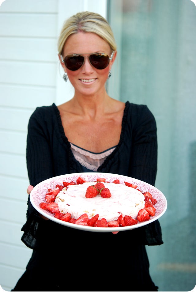 Servera tårtan med färska jordgubbar till. Mums mums mums så gott det var!! Godast när den börjar tina lite men det gör den fort så ta inte fram den för tidigt.
