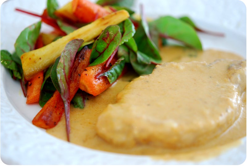 Jag tyckte kotletterna knappt var klara efter så kort tid så jag lät dem gå ca 45 min under lock så de blev möra och saftiga. Smakade upp såsen med mer salt och lite soja, blev riktigt gott. Mangold har jag inte testat förut (smakar lite rödbeta) och det var en kul upptäckt.
