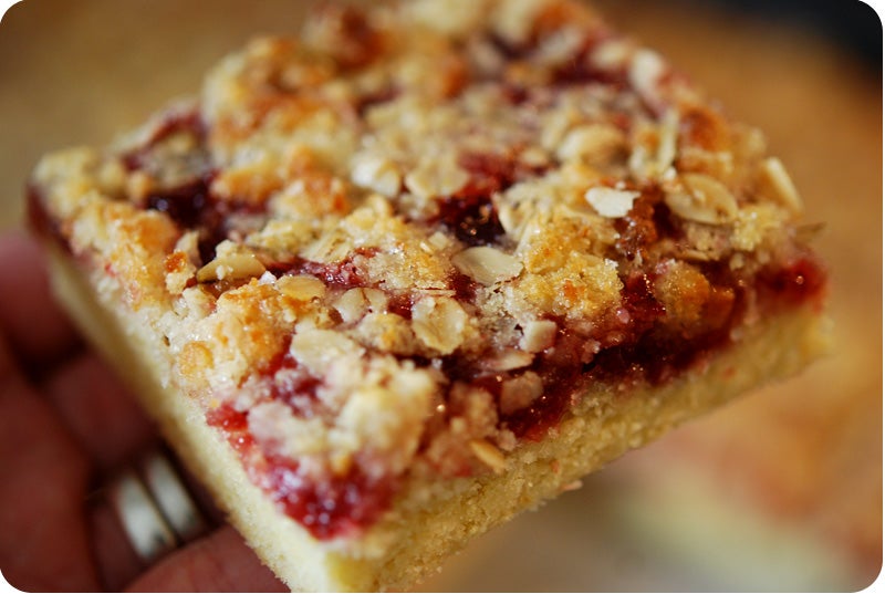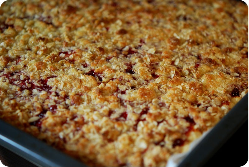 Blanda samman mjöl, socker och bakpulver. Tillsätt matfettet och finfördela det till en grynig massa. Vispa upp ägget. Rör ner det i smuldegen och arbeta raskt ihop till en deg. Tryck ut degen i en smord långpanna ca 20×30 cm. Fördela lingonsylten över kakan. Riv mandelmassan grovt. Blanda samman mandelmassan med havregryn, socker och smält matfett till ett strössel. Strö det över kakan.