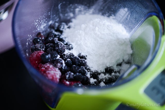 1. Jag gör den alltid med frysta bär så jag har ingen aning tyvärr. Du får prova dig fram! Lycka till!!
