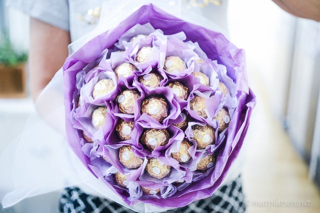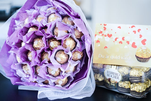 Det är ju iallafall fredag 🙂 Har inte hunnit köpa några fredagsblommor men i går kom ett så himla gulligt bud och gjorde verkligen min dag!! Tack Ferrero Rocher för den ljuvliga ”blom”-buketten med choklad. Har satt den i en vas nu så den får agera fredagsblomma helt enkelt 🙂
