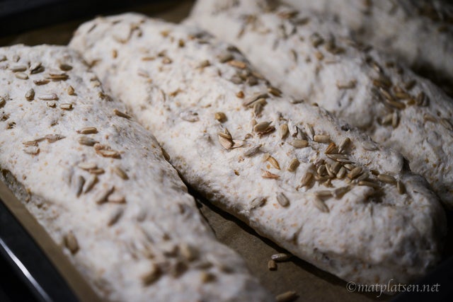 Häll upp degen på bordet, arbeta så lite som möjligt med degen. Dela degen i 2 bitar (bröd) eller 4 bitar (baguetter) och rulla varsamt ut i önskvärd längd. Avsluta med att rulla bitarna i valfri fröblandning. Sätt av på plåt och täck med plast. Låt jäsa ca 1 timme.