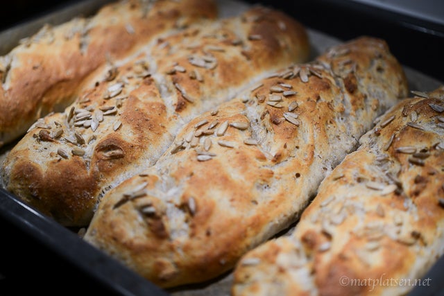 Sätt ugnen på 260 grader och sätt samtidigt in en form med 1 liter vatten längst ner i ugnen. Gör 2-3 snitt över bröden precis innan plåten sätts in i ugnen, sänk temperaturen till 220 grader. Grädda i mitten av ugnen tills brödet får fin färg i ca 20 – 25 min. Låt svalna på galler.