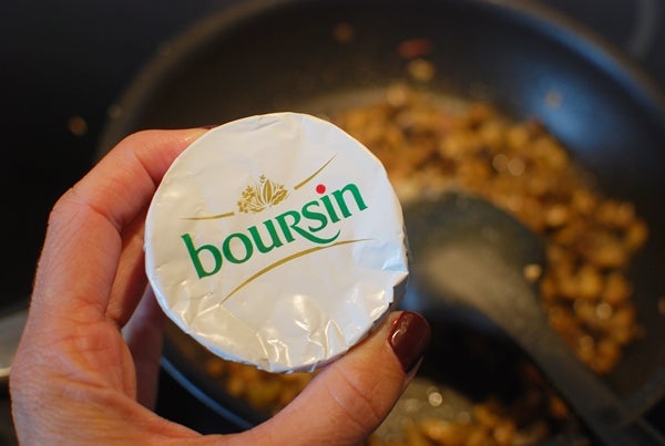 Den brukar finnas i de flesta affärer. Annars funkar cantadou vitlök eller liknande. Minns inte på rak arm hur många gram boursin är.