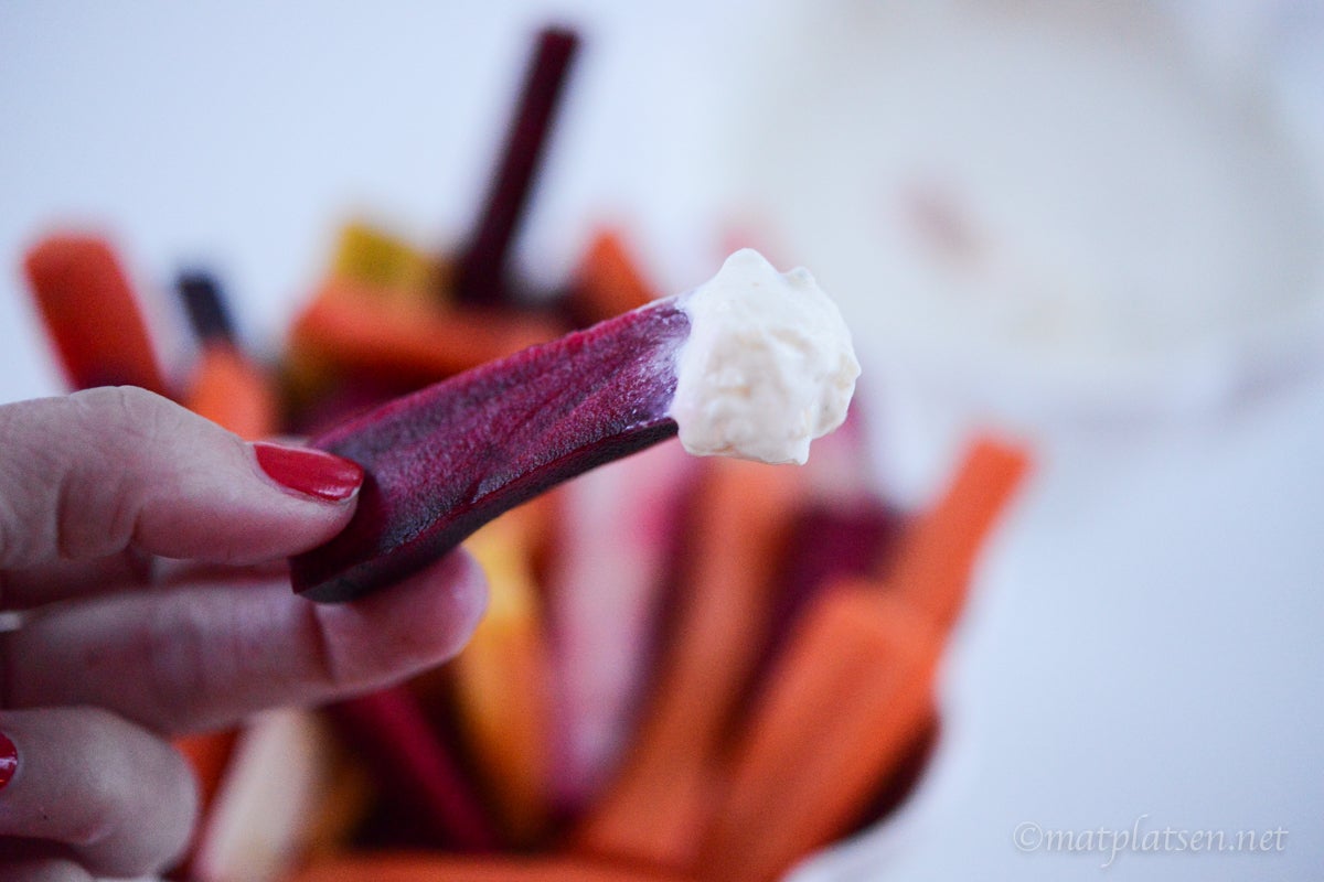 Ett favvo-snacks! Picklade morötter med dipp. Extra läckert att använda morötter i olika färger.