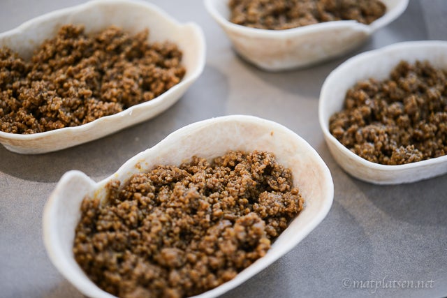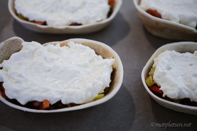 Bryn köttfärsen och löken. Tillsätt vatten och kryddpåsen. Koka så att köttfärsen blir rätt så torr. Lägg färsen i båtarna. Hacka tomater och feferoni. Lägg överst på köttfärsen.