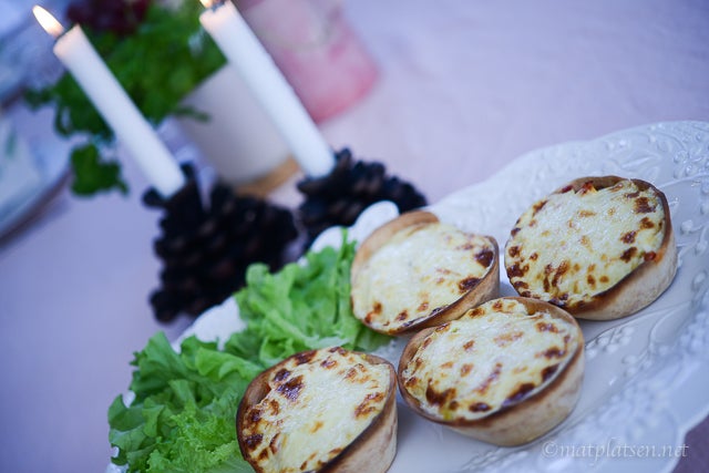 Blanda och bred toppingen ovanpå båtarna. Grädda ca 10 min i 225° tills ytan fått vacker färg.