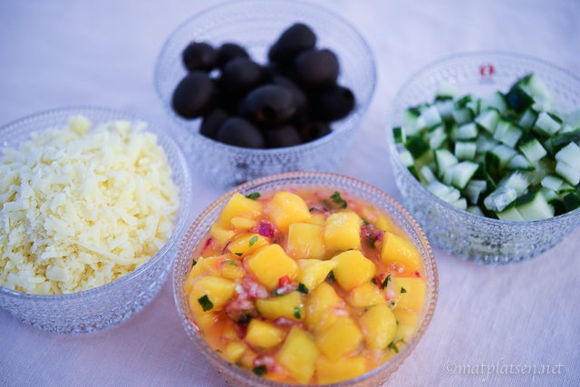 Servera med sallad och taco-tillbehör som tex salsasås, riven ost, gräddfil, oliver, majs, gurka, mangosalsa och sallad. MUMS!!