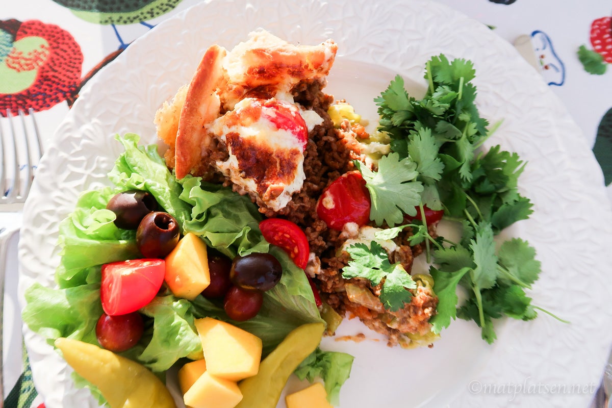 I går åt vi tacopaj på efterfrågan. Niclas absoluta favorit nämligen. Han hade kunnat äta hela pajen själv tror jag 🙂 (tror den ska räcka till ca 8 port men det var i princip inget kvar när vi var kalara – och barnen delade väl på ungefär en normal portion).