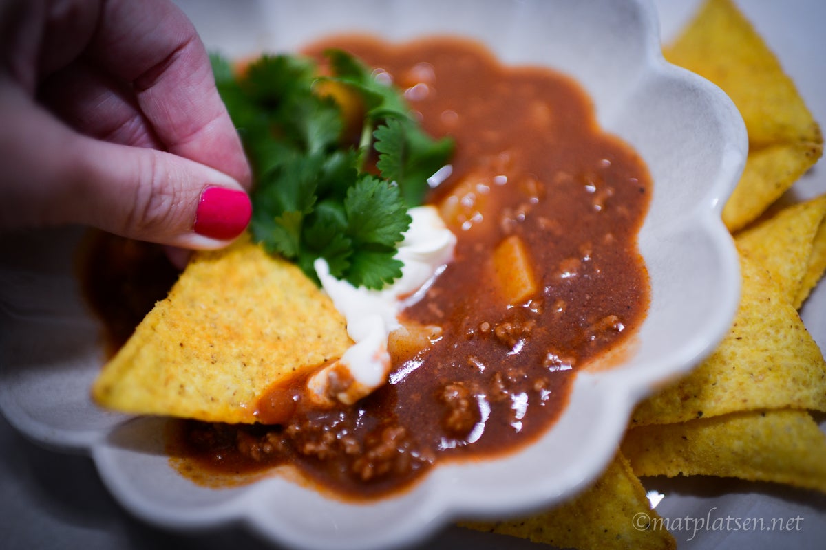 Här kommer en soppa som går hem hos alla här hemma. Mild och god tacosoppa som serveras med nachochips vid sidan om.