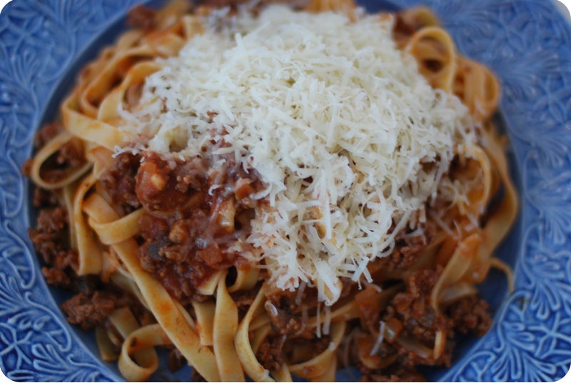 Tisdagsrätten i Evasmatkasse var pasta med köttfärssås. Eller Tagliatelle med köttfärssås med champinjoner och rosmarin för att vara exakt 😉