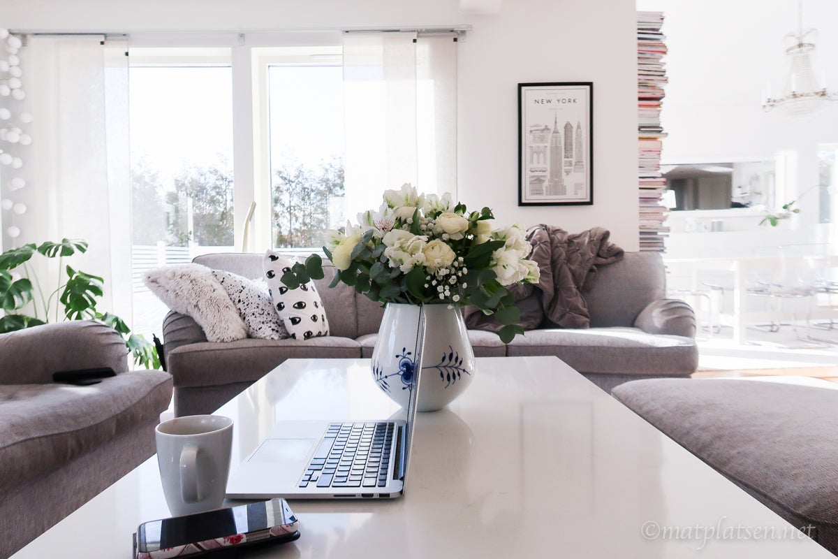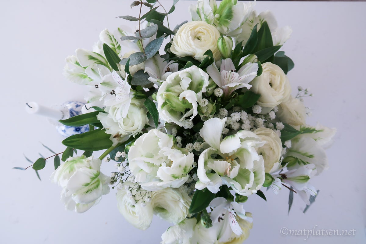 Solen badar in från alla håll och kanter här hemma. Fredagsbuketten är finare än nånsin, börjar se yvig och busig ut. Kaffe och Nyhetsmorgon på tv:n.