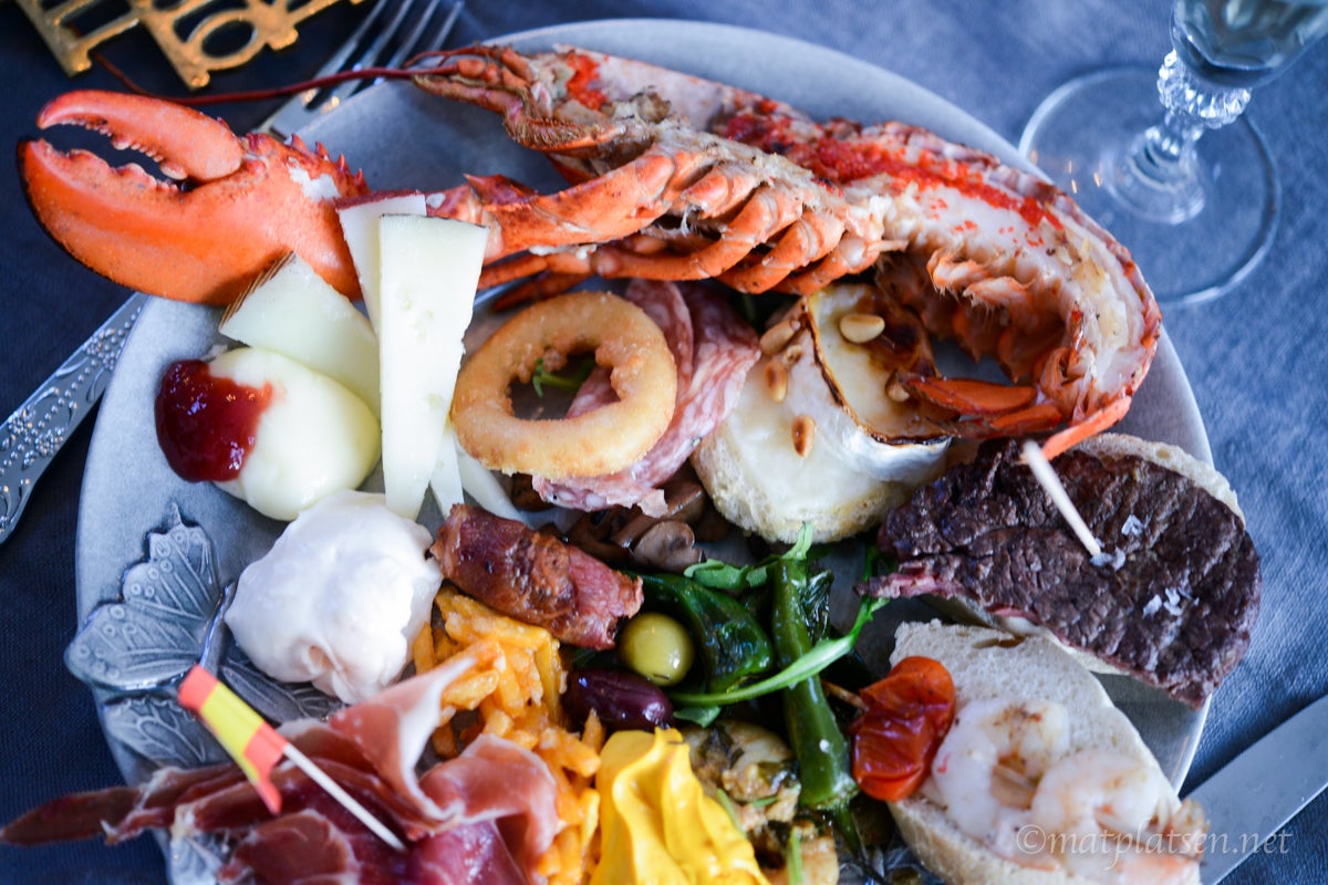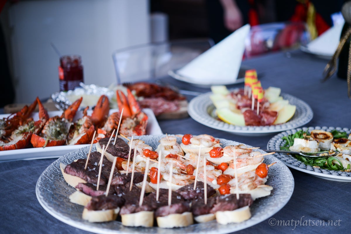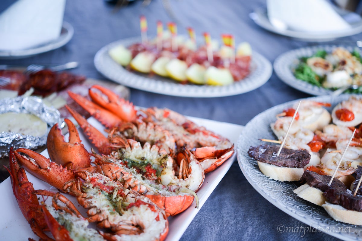 Hade alla möjliga lyxiga smårätter på bordet och till dessa drack vi genomgående bubblet till, passade utmärkt till alla smaker. Så gott! Där fanns chevretoasts, pinchos med grillade vitlöksräkor och grillad oxfilé, baconlindade dadlar, vitlöksfrästa skogschampinjoner, het räkgryta med spiskummin, melon med spansk skinka, oliver, aioli, grillade humrar, ostar och korvar.