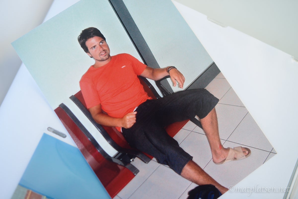Resan avslutades lite snöpligt med att busschauffören kastade ut en resväska rakt på Mickes smalben. Syns inte så bra på bilden kanske men det blev ett ruggigt sår som inte läkte på bra länge. Han har än i dag ett stort ärr där.